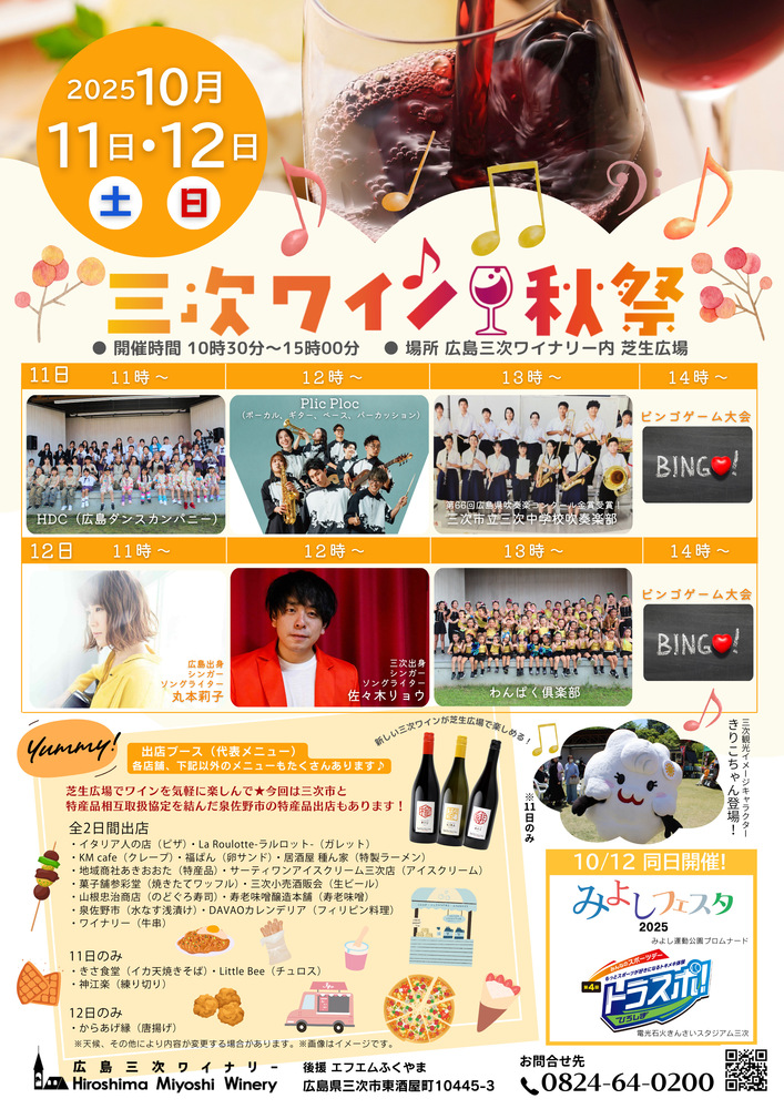三次ワイン秋祭 SCHEDULE 2025/10/11(土) 12:00 - 12:30 三次ワイナリー 毎年開催される、三次ワイナリーでのイベント 【三次ワイン秋祭🍷】 気持ちのいい芝生広場にて二日間開催されます! Plic Ploc LIVEは 12:00 スタート! 出演メンバー 日上敬愛 (vo) RISA (key) 住田卓也 (ba) 藤原芳葵 (per) おいしいフードもたくさん出店あり! ワインに音楽に楽しいひと時をお過ごしください。 URLをコピーする 報告する