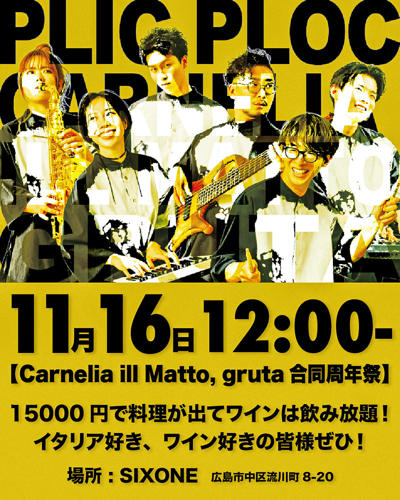府中町にあるお肉とワイン専門のレストラン「Carnelia ill Matto」と、広島市西区古江のトラットリア「gruta」の合同周年祭にPlic Plocが参加させていただきます!